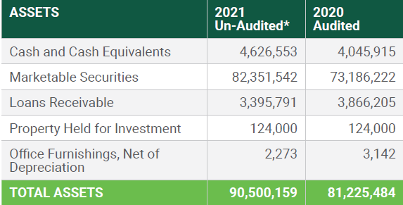 It is my pleasure to report that our investment services are growing. At the close of 2021 we had $90+ Million under management. We continue our partnership with Wespath, not only because their smart and disciplined investment strategy gives us confidence, but also because they strive to be a great example of Christian stewardship.